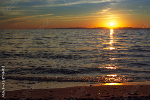 © Clara_Sh., Fototapeta premium Scenic sunset on Lake Baikal in dark moody colors, the bright sun sets over the horizon above calm waves