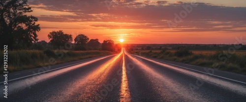 Naklejka premium Scenic Sunset Over Open Road With Tranquil Landscape and Clear Sky Ideal For...