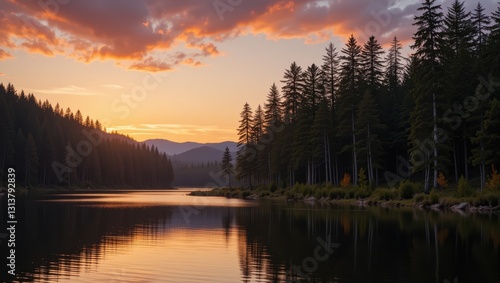 Fototapeta premium Scenic Sunset Over Serene Lake Surrounded By Majestic Pine Forest And...