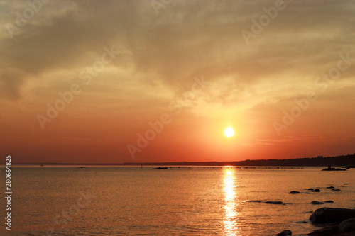 © Vera, Fototapeta premium Scenic sunset over the sea. Reflection of the sun in water. The sky is painted with bright colors. Sunset beach in a summer evening. Gulf of Finland, Baltic sea, Komarovo, Saint-Petersburg, Russia.
