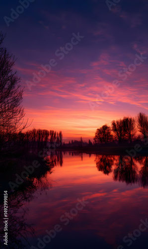 © Lucianastudio, Fototapeta premium Scenic sunset over tranquil lake reflects vibrant colors creating a peaceful and serene atmosphere