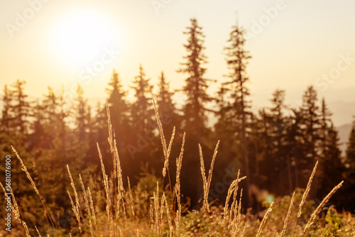 © marina_larina, Fototapeta premium Scenic sunset Pamporovo Rhodope mountains Bulgaria, pine tree silhouettes under golden light showing peaceful untouched nature summer tourism eco holidays adventure travel perfect