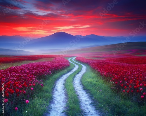 © Mr, Fototapeta premium Scenic Sunset Path Through Vibrant Red Flower Field and Mountains
