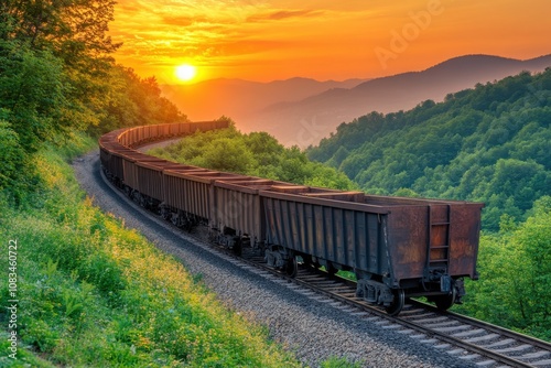 © Abdul, Fototapeta premium Scenic Sunset Train Traveling Through Forested Area