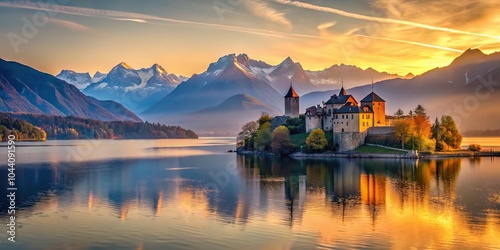 © Latsamee, Fototapeta premium Scenic sunset view of castle on lake with mountains in background