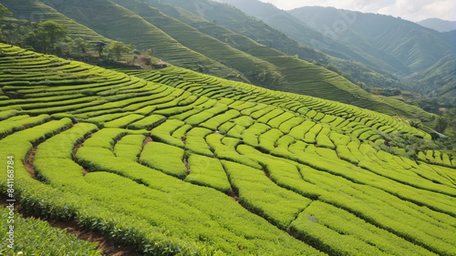 Fototapeta premium Scenic Tea Estate: Neatly Terraced Fields Stretching Across Hills, Generative AI