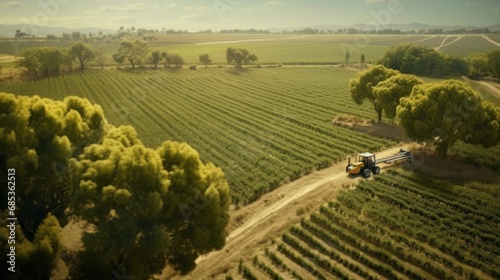 © Werckmeister, Naklejka premium Scenic top view of a tractor spraying green fields. Organic irrigation field.