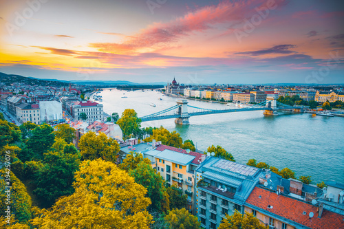 © Leonid Tit, Naklejka premium Scenic top view of the Hungarian Parliament and Chain Bridge on the Danube river at sunset.