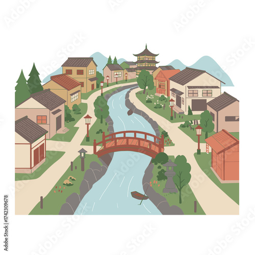 Naklejka premium scenic town with river and traditional buildings overlooking mountains