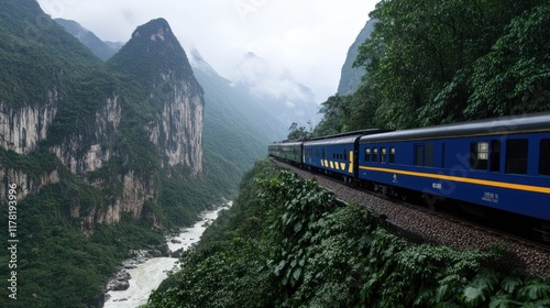 © Muhyidin, Fototapeta premium Scenic train journey through lush mountains and river valley.