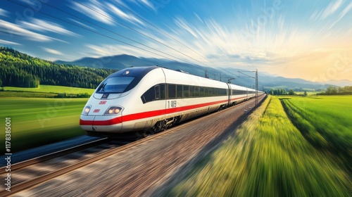 Fototapeta premium Scenic Train Passing Through Green Fields and Mountains