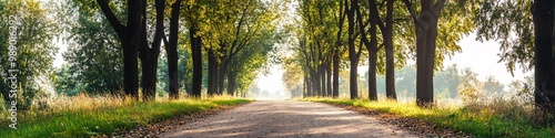 © MaxStock, Naklejka premium Scenic tree line road in autumn sunlight