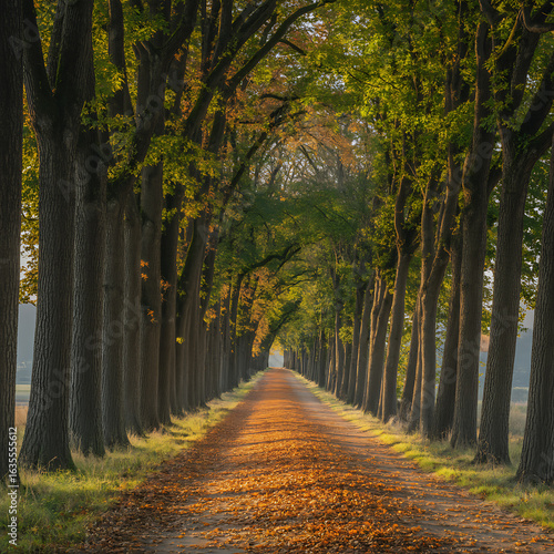 © BIDHAN, Fototapeta premium Scenic Tree-Lined Avenue in Warm Autumn Sunlight