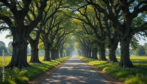 © Kitta Studio, Fototapeta premium Scenic Tree-Lined Pathway Under Bright Blue Sky with Green Foliage
