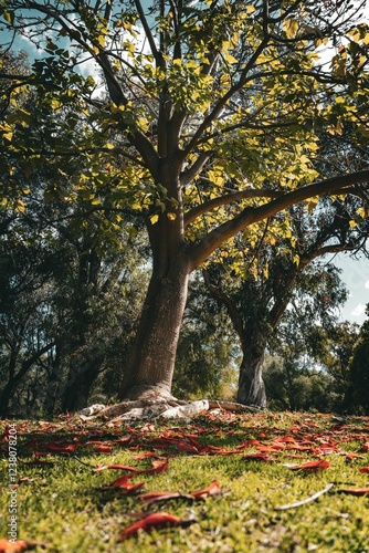 © Wirestock, Naklejka premium Scenic tree with lush leaves and red petals.