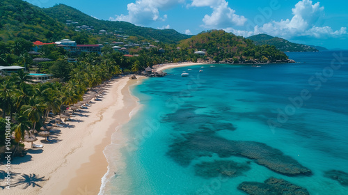 © Rafaqat Batool, Obraz premium Scenic Tropical Beach with Coral Reefs and Mountain Backdrop