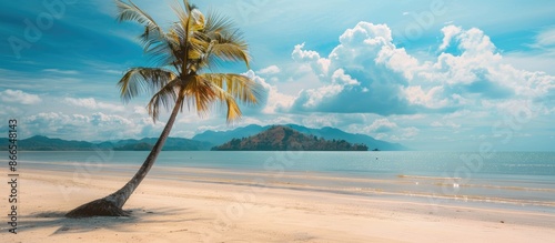 Fototapeta premium Scenic tropical beach with palm tree featured in panoramic banner image.