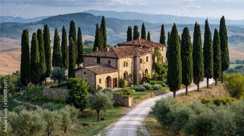 Fototapeta premium Scenic tuscan villa surrounded by cypress trees and rolling hills in italy