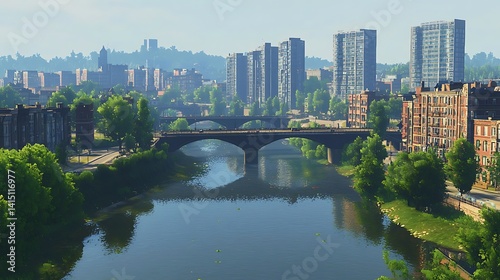 Obraz premium Scenic Urban Landscape, Tranquil River Flowing Through a Bustling Cityscape