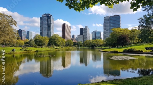 © Biancaart, Fototapeta premium Scenic urban oasis featuring a tranquil lake mirroring the cityscape skyline