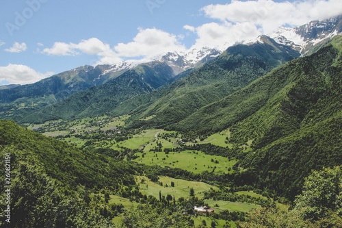© Baifoworld, Fototapeta premium Scenic valley in the Caucasus Mountains with a small village, summer greens and snow-capped peaks