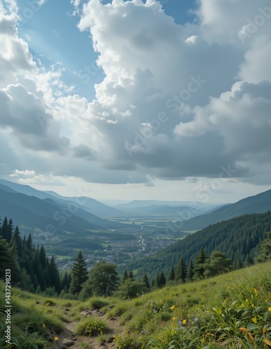 © mh, Fototapeta premium Scenic Valley View From Hillside with Clouds and Distant Mountains