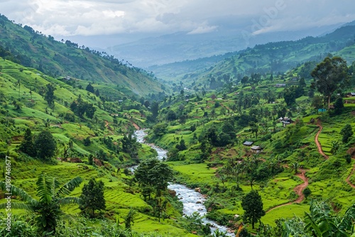 © Adi, Fototapeta premium Scenic Valley View with River Flowing Through Lush Green Landscape