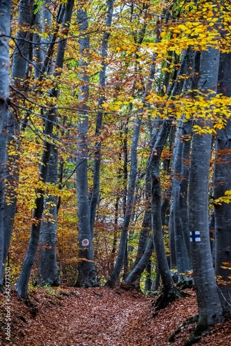 © Adrian Vaida/Wirestock Creators, Fototapeta premium Scenic vertical shot of trees in a forest with autumn leaves on the ground