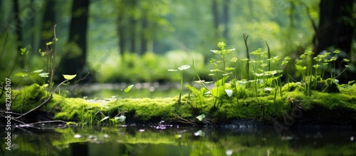 Obraz premium Scenic view featuring dense green vegetation, moss, and grass in a swamp setting, with a blurred background ideal for a copy space image.
