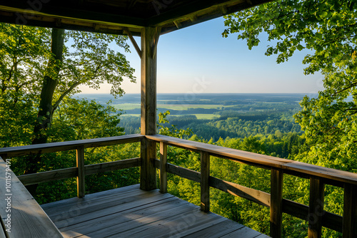 © HNXS Digital Art, Obraz premium Scenic View from a Wooden Deck Overlooking Vast Green Forests and Rolling Hills