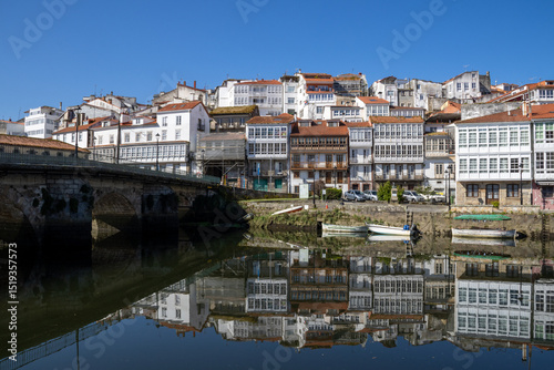 Obraz premium Scenic view from Praza a Enrique Ivntiga Eira Vella, Betanzos, Galicia, with riverside white homes and boats reflecting on the peaceful Mandeo River.