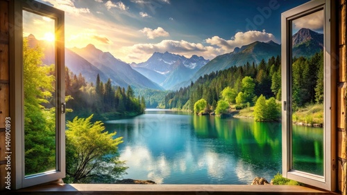 Obraz premium Scenic View from Window of Majestic Mountains and Serene Lake - Nature...