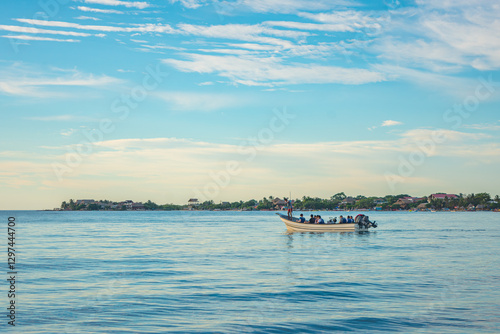 © Jhampier Giron, Fototapeta premium Scenic view of a boat in Rincon del Mar, Sucre, Colombia with serene waters and blue sky