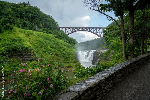 © Clinton Weaver/Wirestock Creators, Fototapeta premium Scenic view of a bridge crossing a waterfall with a lush green forest in Letchworth State Park