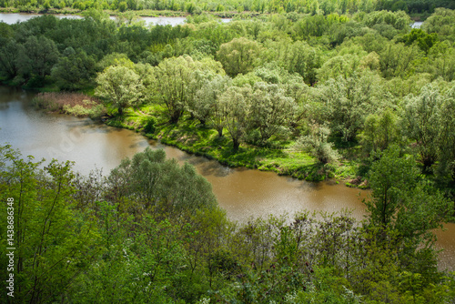 Fototapeta premium Scenic view of a calm river meandering through lush green forest in spring,...