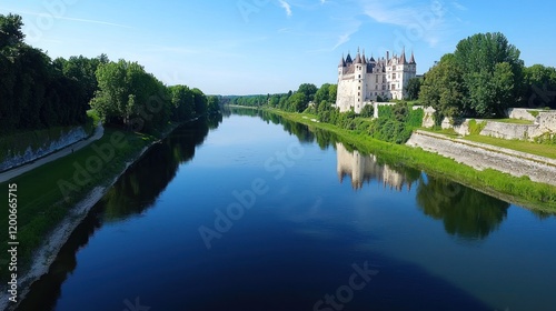 Obraz premium Scenic view of a castle beside a serene river with lush greenery.