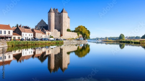 © Mabdul, Fototapeta premium Scenic view of a castle by a river, reflecting in calm waters.