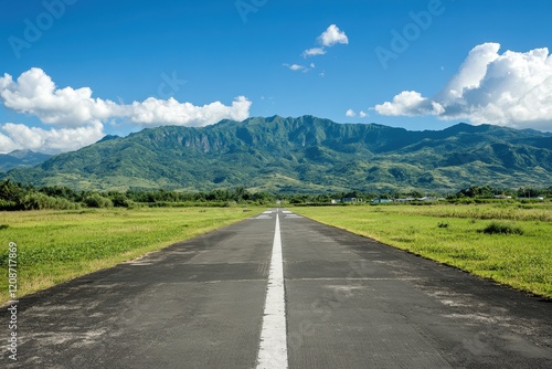 © MuhammadSalman, Naklejka premium Scenic View of a Clear Airstrip with Majestic Mountains and Lush Greenery Under a Bright Blue Sky and Fluffy White Clouds in a Serene Landscape