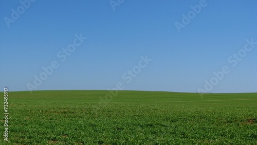 Fototapeta premium Scenic view of a field of green grass under a cloudless blue sky