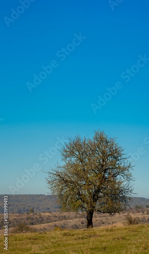 Fototapeta premium Scenic view of a green solitary tree on a grassy hillside under a clear blue sky