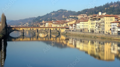 © julio, Fototapeta premium Scenic view of a historic bridge and riverside buildings.