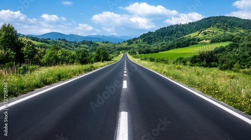 Fototapeta premium Scenic view of a long winding road cutting through lush fields and rolling hills under a bright blue sky : Generative AI