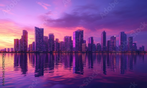 Fototapeta premium Scenic view of a modern city skyline at twilight, vibrant hues of purple and orange reflecting off glass buildings, calm water adding serenity,