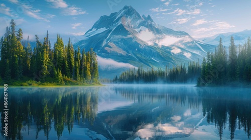 © The 2R Artificiality, Naklejka premium Scenic view of a mountain and lake in summer
