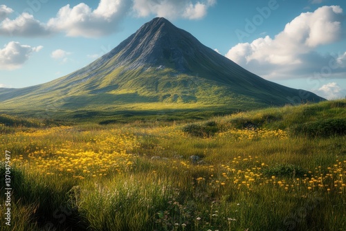 © YouraPechkin, Fototapeta premium Scenic view of a mountain surrounded by vibrant wildflowers in a peaceful landscape