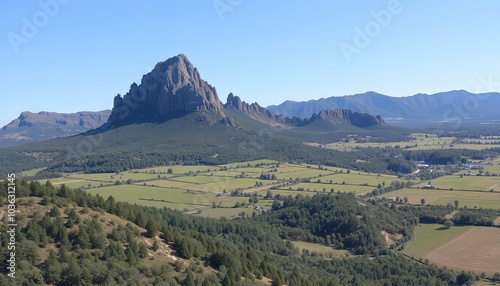 Naklejka premium Scenic view of a prominent mountain surrounded by green fields.