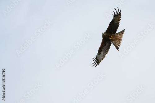 Obraz premium Scenic view of a red kite flying in the cloudy sky in Rhayader, Wales