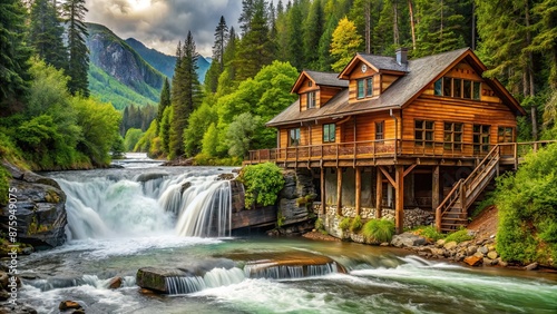 Naklejka premium Scenic view of a rustic fishing lodge at Waterfall Resort in Alaska, Alaska, wilderness, lodge, fishing, resort, rustic