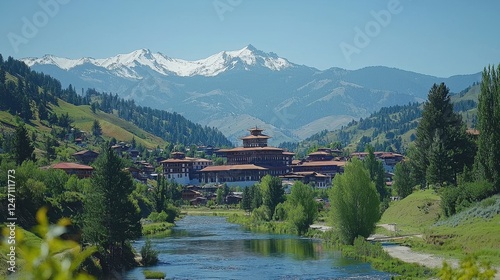 Fototapeta premium Scenic view of a traditional building by a river with mountains in the...