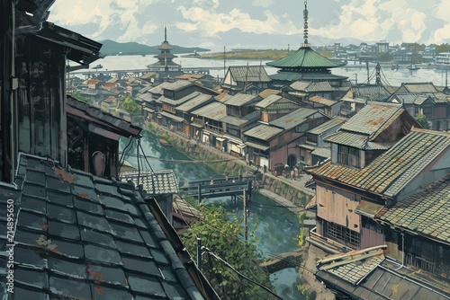 © LadiesWin, Fototapeta premium Scenic View of a Traditional Japanese Riverside Town